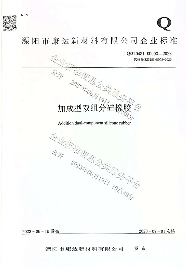 單包裝室溫固化硅橡膠仍舊執行行業(yè)標準:HG/T3947-2007單組分室溫硫化有機硅膠黏劑/密封劑;雙組分硅橡膠分別執行企業(yè)標準:Q/320481KD003-2023加成型雙組分硅橡膠、Q/320481KD004-2023縮合型雙組分硅橡膠。